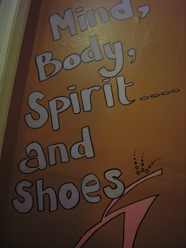 It took a while to check in because eight English men wearing football shirts were also in the process of checking in and the receptionist was trying to explain to them why she would have to keep their room keys until they paid the £250 damage deposit. By the time I got up to the counter, she was so furious and exhausted that she forgot to collect my deposit, told me to have fun, and then sent me up four flights of stairs to my room. The room was covered in gaudy floral murals and stupid sayings like "Mind, Body, Spirit, and Shoes" (OFFENSIVE) but the bathroom had a real, working shower, and the place was clean and smelled normal. I opted for the all-girl dorm partially because it was the least expensive but also because staying above that middle-aged Finnish man who slept naked in my London hostel was really traumatic.